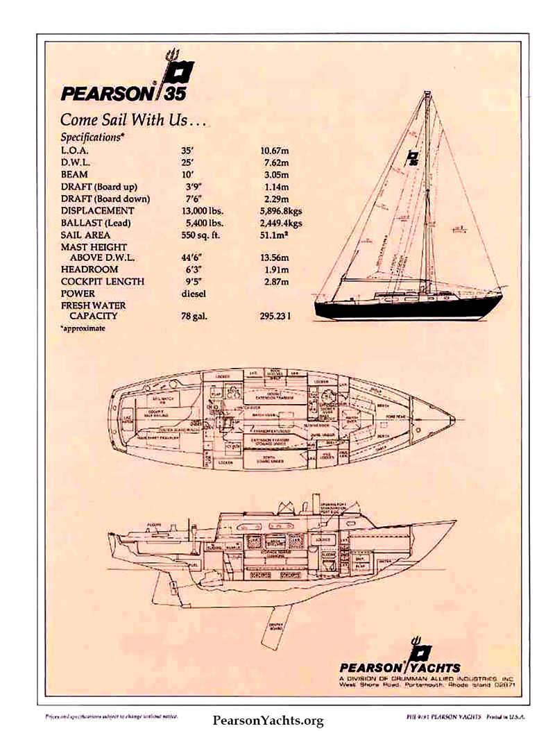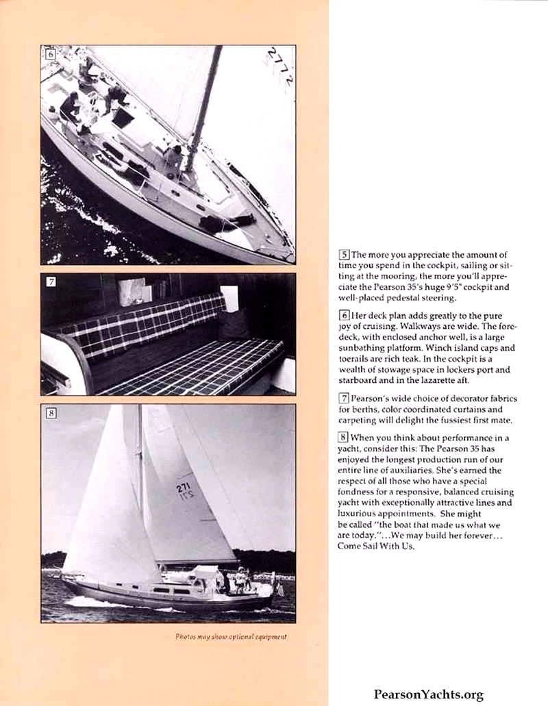 When you think about performance in a yacht, consider this: The Pearson 35 has enjoyed the longest production fun of our entire line of auxiliaries. She’s earned the respect of all those who have a special fondness for a responsive balanced cruising yacht with exceptionally attractive lines and luxurious appointments. She might be called "the boat that made us what we are today."…We may build her forever… Come Sail with Us.