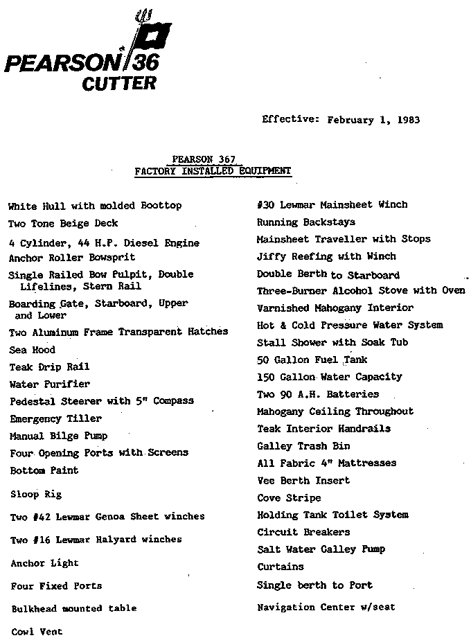 Our Pearson 36 Cutter is a particular joy. Not only does she boast all the inherent advantages of her rig, but we've given her a huge cockpit with comfortable backrests, bulwarks for safer footing, a roller sprit for simple anchoring and a moderately shallow draft for a boat of her size.
